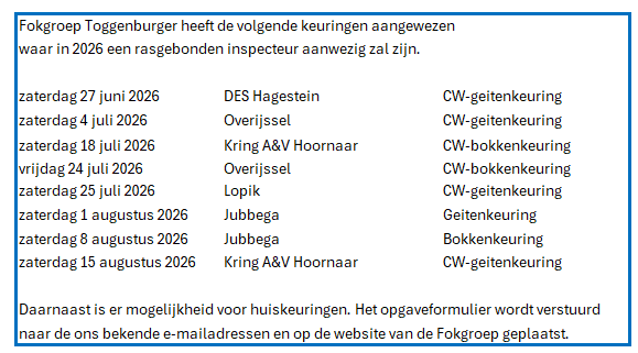 Het is mogelijk om rasgebonden inspecteurs voor uw keuring aan te vragen.